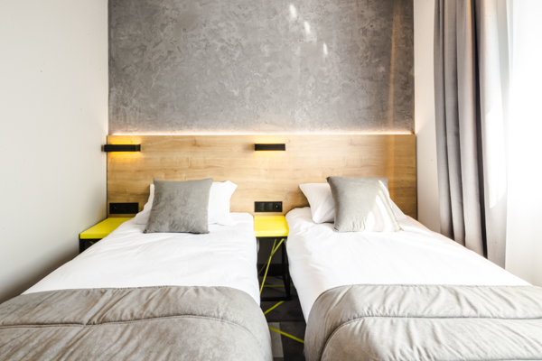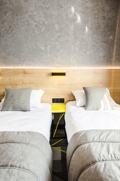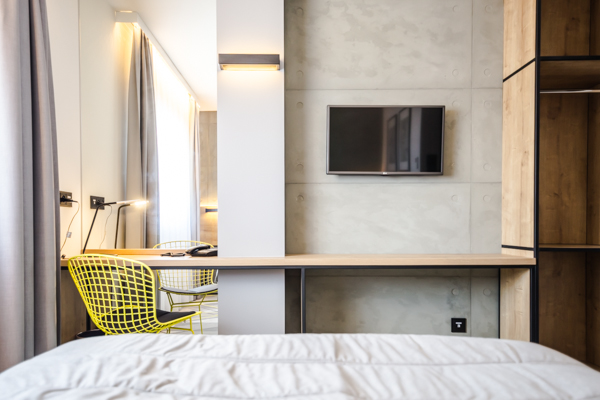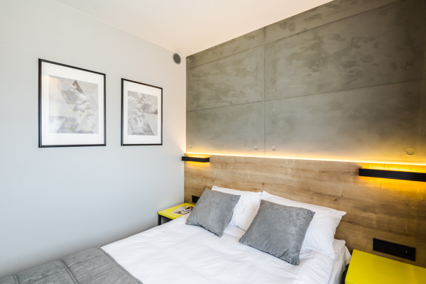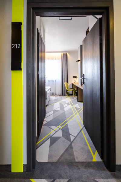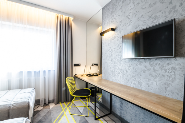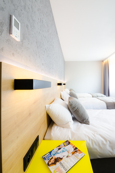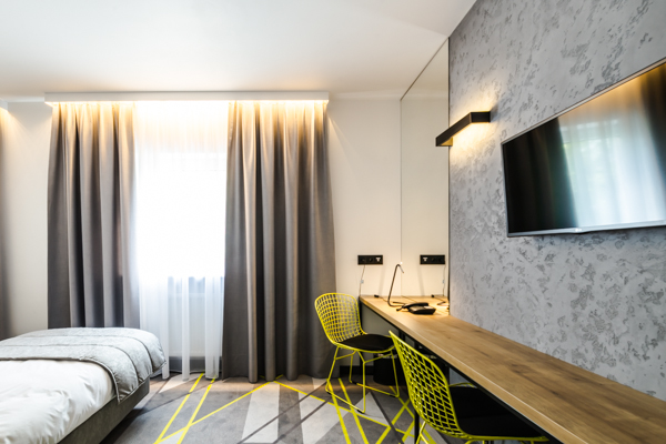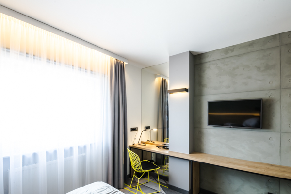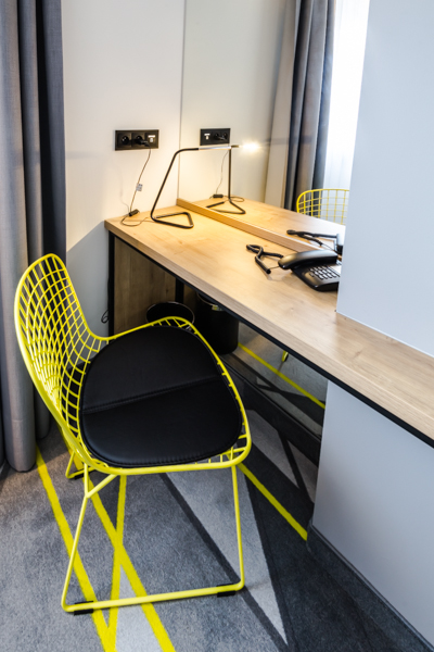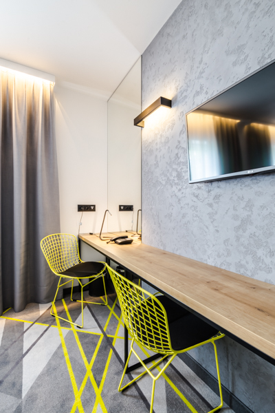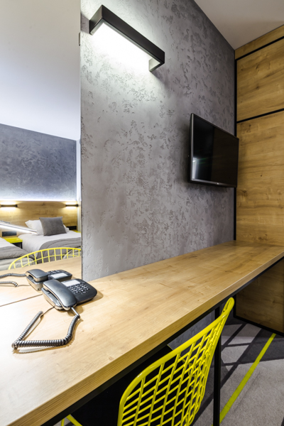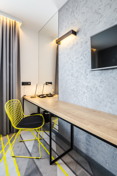 Air Hotel Air Hotel Inwestorzy postawili na wystrój nowoczesny, prostota przeplatająca się z kolorem przewodnim. Meble wyprodukowane zostały z płyty melaminowanej i z płyty lakierowanej, a dodatkowo szafa miała konstrukcję metalową, w którą wchodziły płyty.