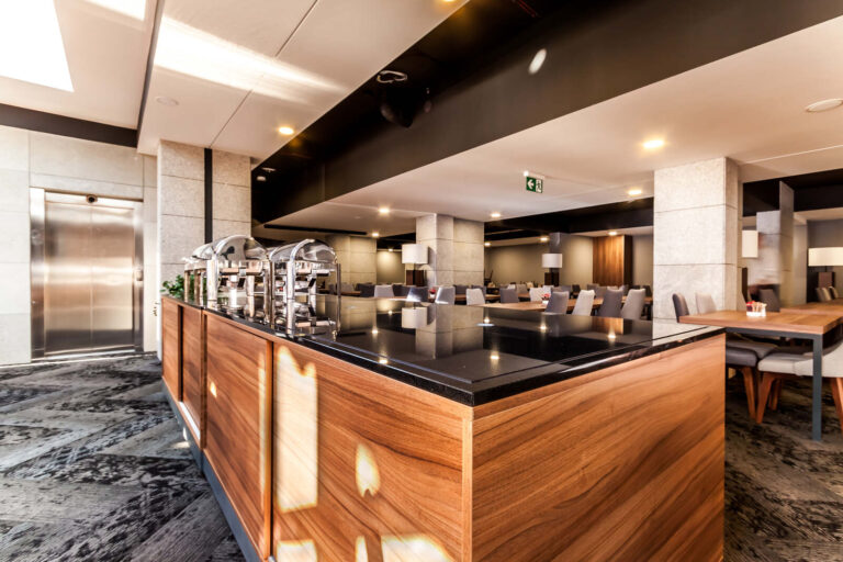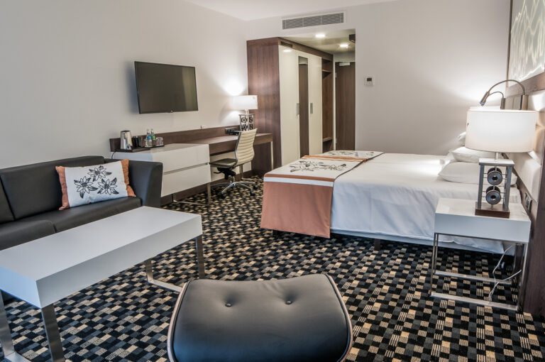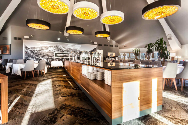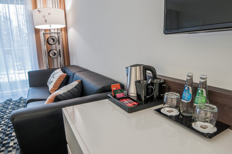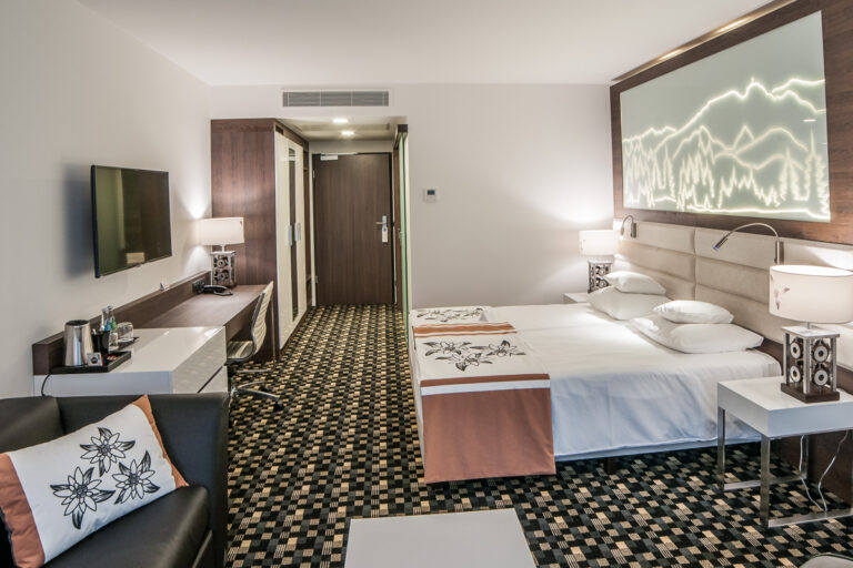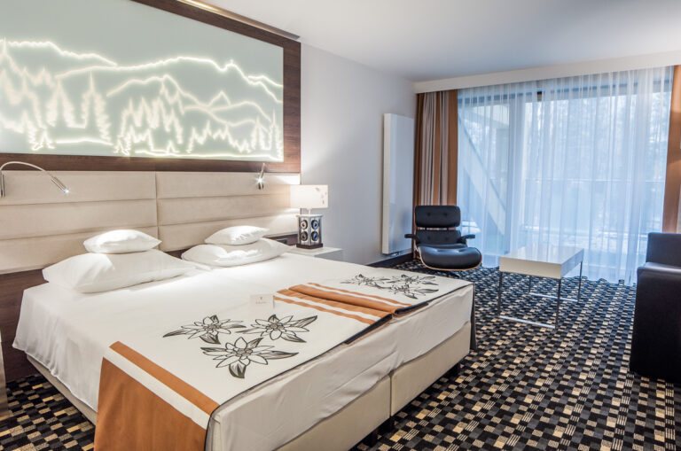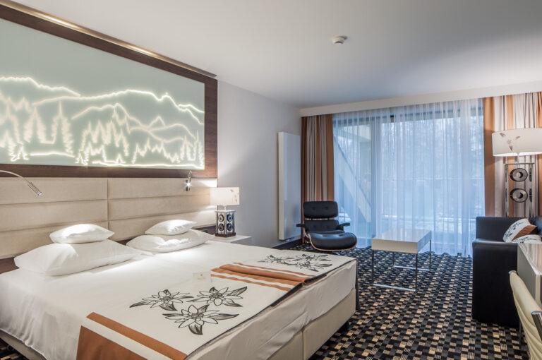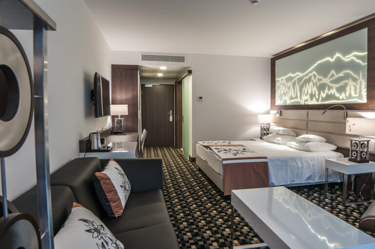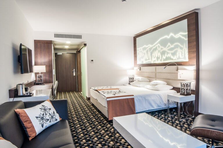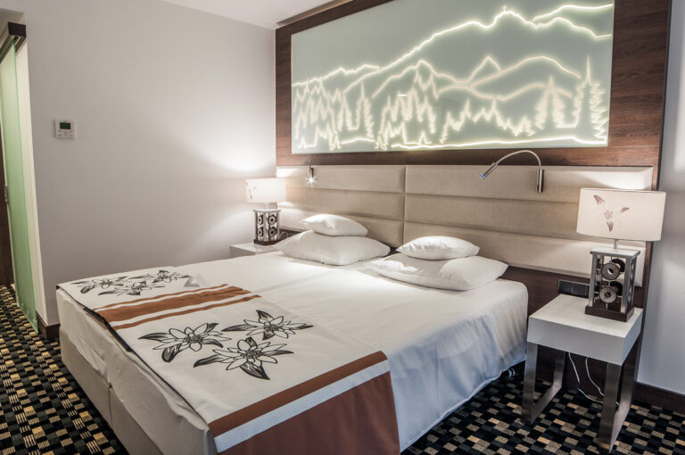 To szyk i elegancja połączony z praktycznym wykorzystaniem mebli z płyty HPL. Stworzyliśmy specjalnie dla tego Hotelu szklane wezgłowia podświetlane z motywem gór. Całość komponuje się pięknie dzięki czemu pokoje hotelowe jak i części wspólne wprawiają przybyłych gości w zachwyt.