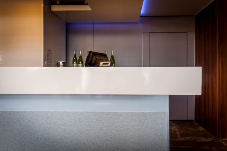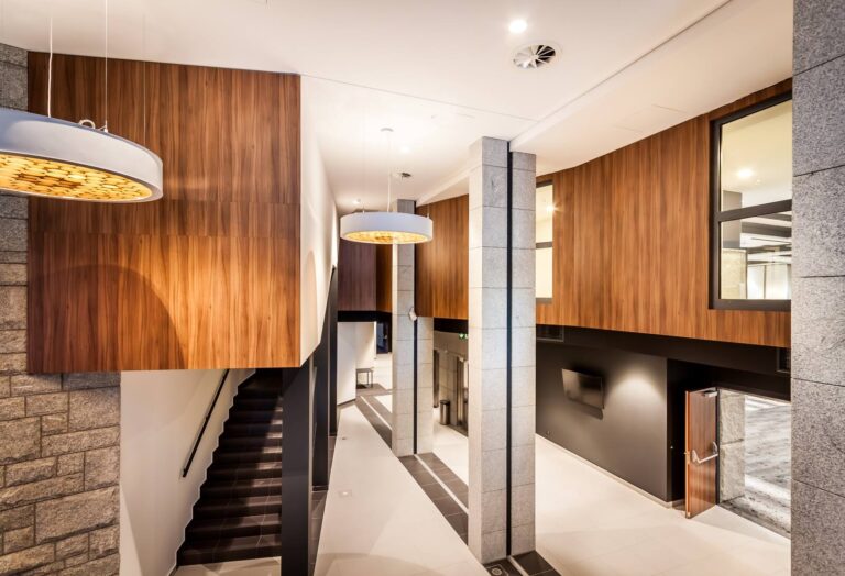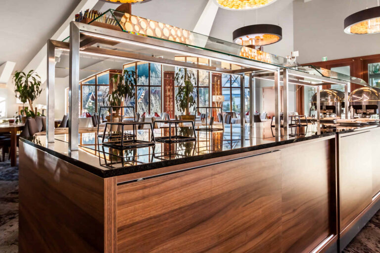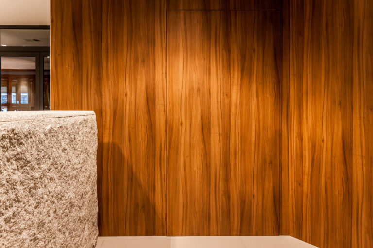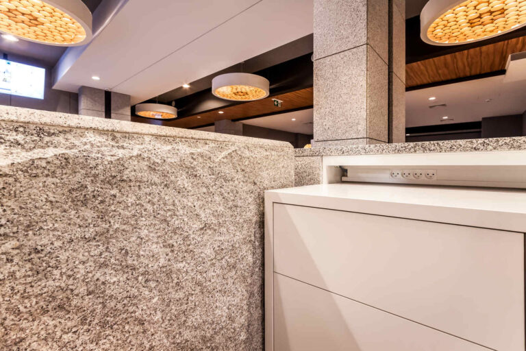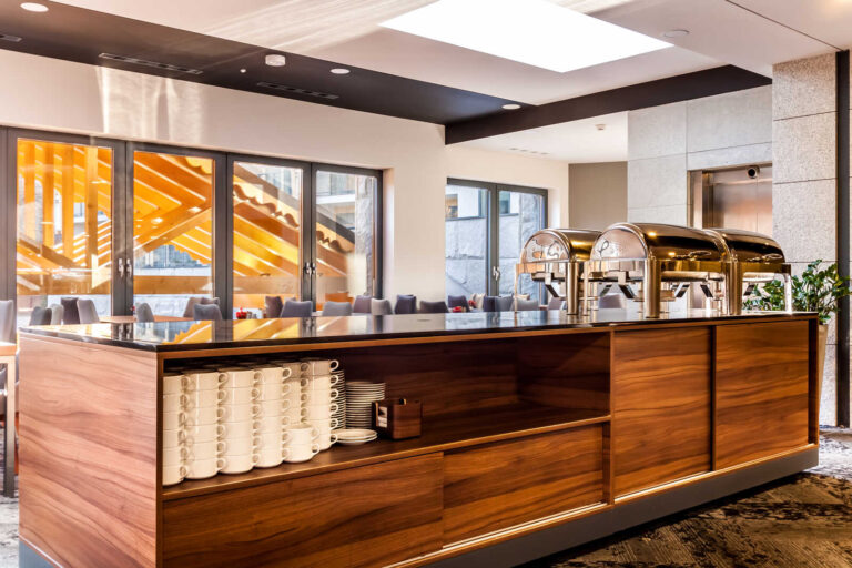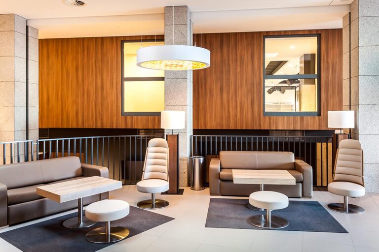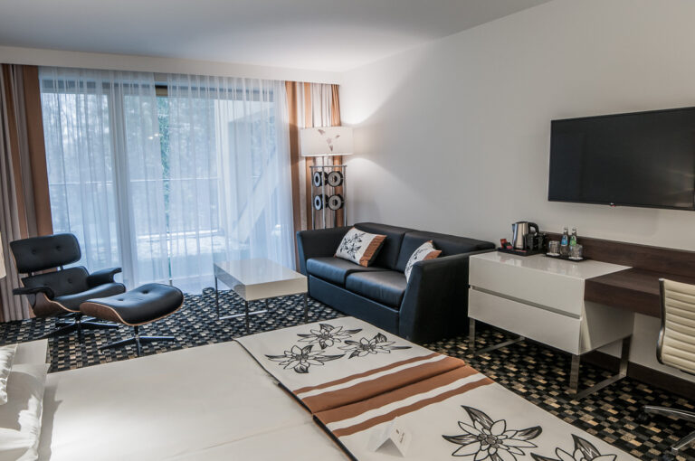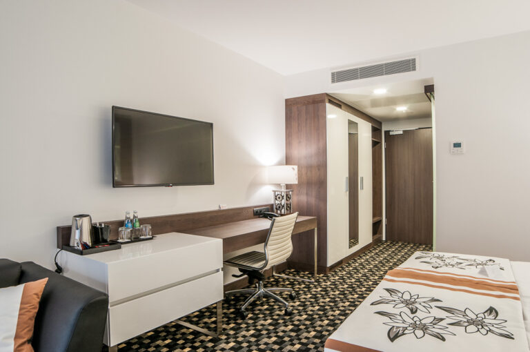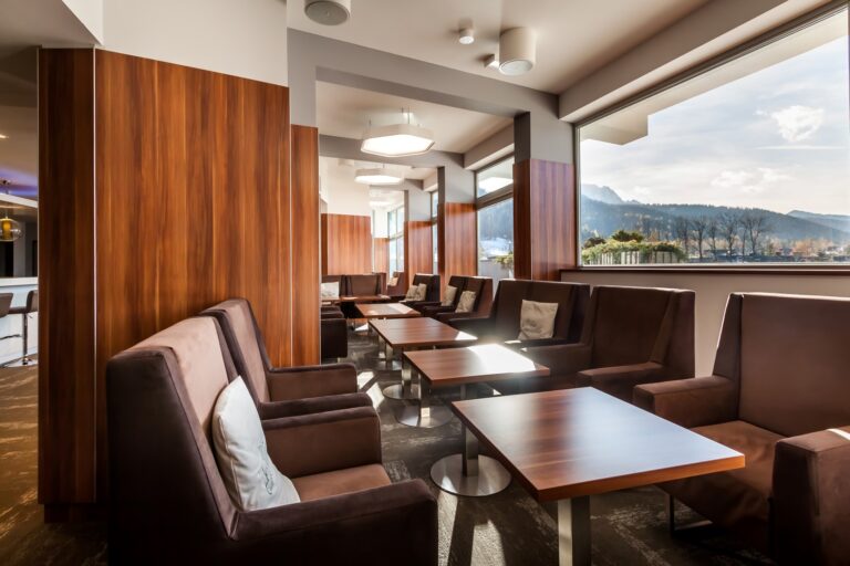 To szyk i elegancja połączony z praktycznym wykorzystaniem mebli z płyty HPL. Stworzyliśmy specjalnie dla tego Hotelu szklane wezgłowia podświetlane z motywem gór. Całość komponuje się pięknie dzięki czemu pokoje hotelowe jak i części wspólne wprawiają przybyłych gości w zachwyt.